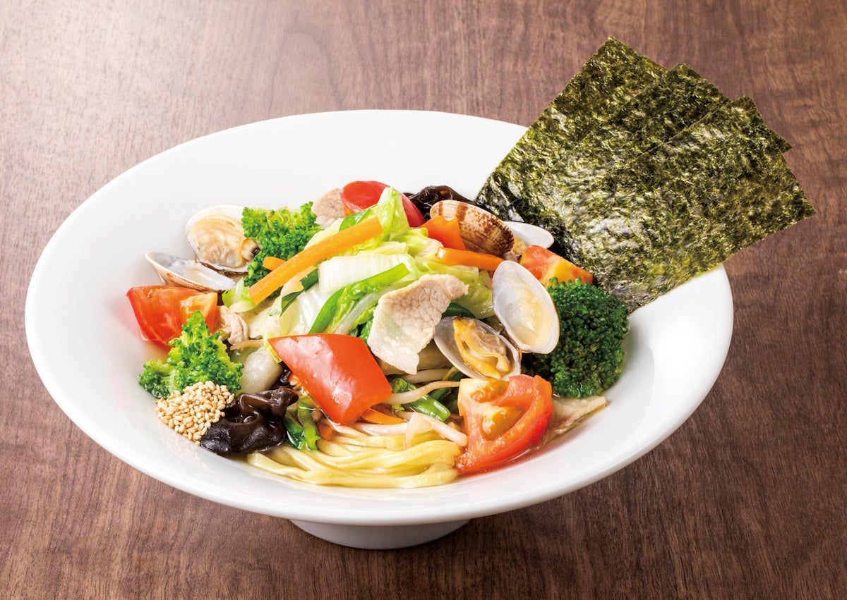 トマトやブロッコリーなど彩り鮮やかな野菜とともに、あさりや豚肉、白ゴマや、海苔などたっぷりの具材が楽しめる一杯です。