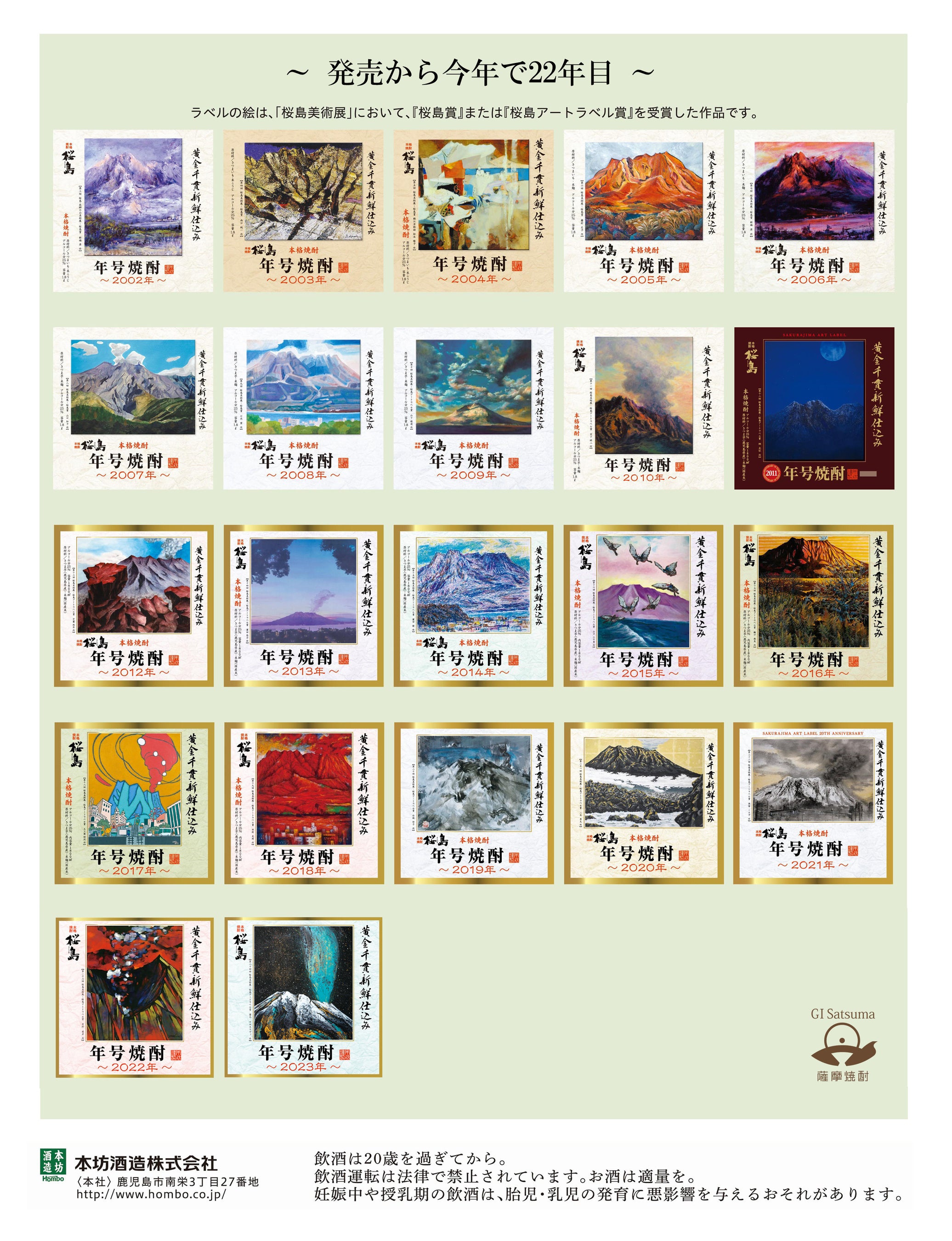 また、弊社の桜島年号焼酎は毎年アートラベルを採用させていただいております。今年のラベルデザインは、2023年2月に開催された「第24回 桜島美術展」の桜島アートラベル賞受賞の濵元 ヤロスラヴァ様の作品です。毎年かわるラベルデザインもあわせてお楽しみください。