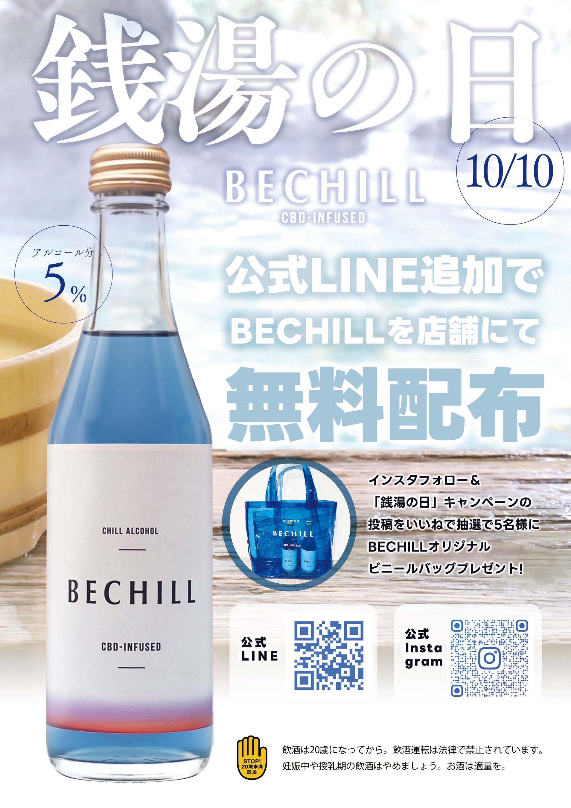 日本初のリラクゼーションアルコール飲料「BECHILL(ビーチル)」を展開するC-position株式会社(本社:東京都渋谷区、代表取締役社長:渡辺裕斗)は、日本の銭湯文化の更なる発展を願い10月10日を「銭湯の日」として祝う為、東京23区の銭湯・サウナ施設にてサンプリング企画を実施致します。