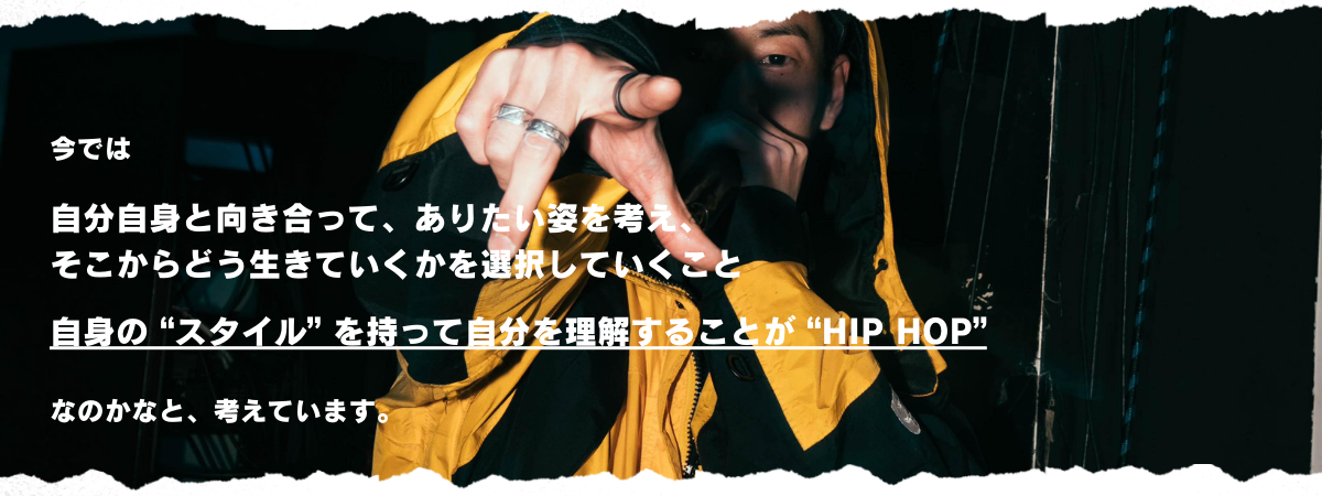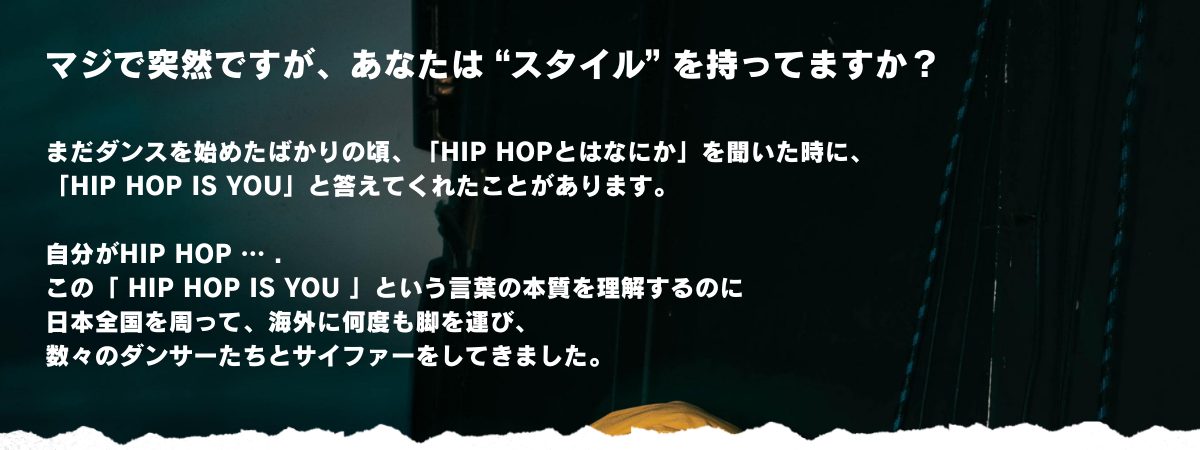 2015年からブレイクダンスを始め、日本各地、そして、韓国、シンガポールなど、国内外問わず、数々のバトルイベントに参加。2016年にはBBOY CREW 「DROPZ」を結成し、毎年日本全国からダンサーが集結するアニバーサリーイベントを開催、またバトルイベントのMCを務めるなど、ストリートダンスシーンを支えている。