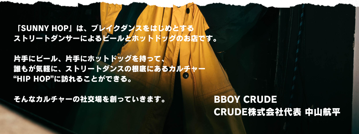 CRUDE株式会社(東京都世田谷区、代表:中山航平/BBOY:CRUDE)は、2023年10月7日(土)下北沢にBEER & HOT DOG SHOP「SUNNY HOP」(サニーホップ)をオープンします。