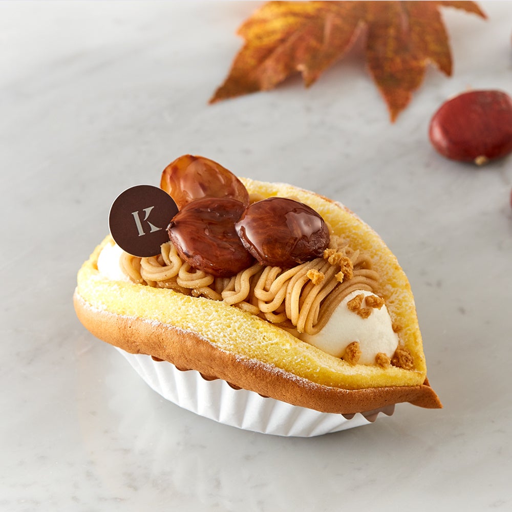 マロンペーストに渋皮栗をのせて、こだわりのオムレット生地の中には求肥とつぶあん、刻んだ栗を入れ贅沢に仕上げました。