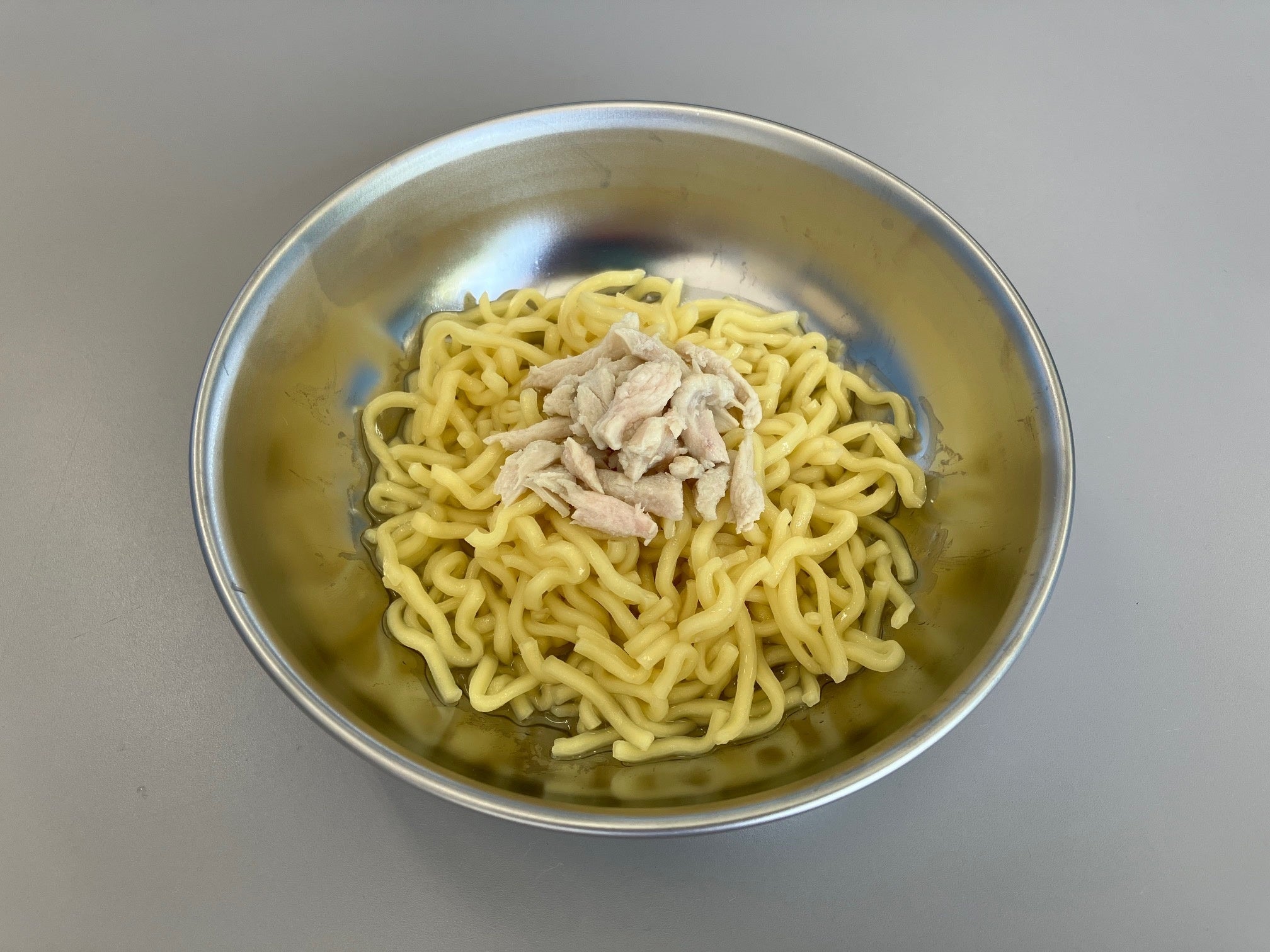 与える量は、5kg以下は麺3分の1玉と鶏胸肉入スープ1袋。5~15kgは麺3分の2玉と鶏胸肉入スープ2袋、15kg以上は麺1玉と鶏胸肉入スープ3袋を目安にしてください。