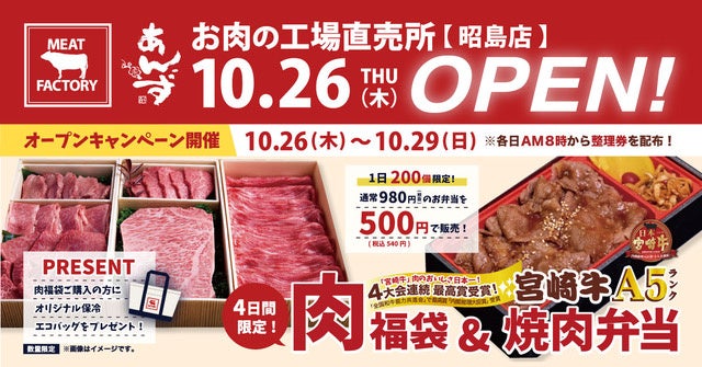 この度オープンを記念し、10月26日(木)~29日(日)の4日間、最上級A5ランク宮崎牛を贅沢に詰めた限定の「肉福袋」や、厳選した宮崎牛を自家製の焼肉のたれに絡めた旨味たっぷりの焼肉弁当を、通常よりもさらにお得なお手頃価格でご購入いただけるオープンキャンペーンを開催いたします。