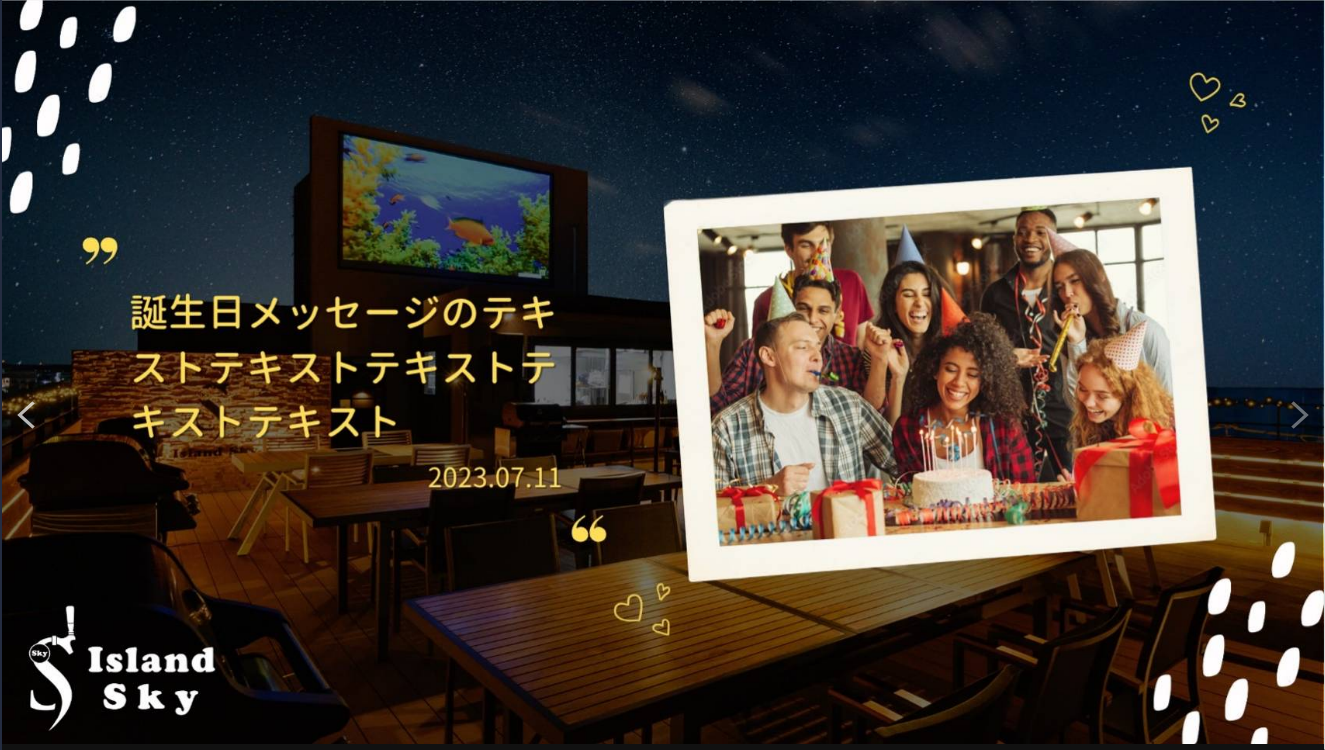 テンプレート動画(1動画あたり約1分程度)をご利用になりたい場合は、動画で使用したい【画像データを5枚】と【30文字以内のメッセージ】をお考えの上、スタッフへご相談下さい。