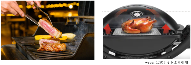 (左:実際に焼いている写真、右:グリルの中で熱が循環するイメージ図:Weber公式サイトより引用)