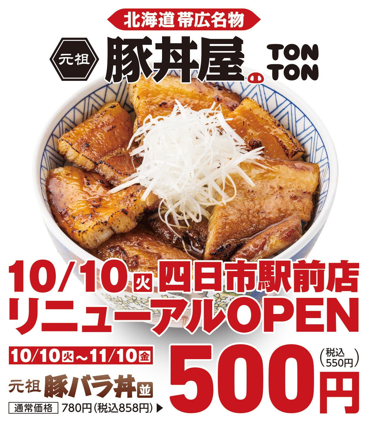ワンズトライン株式会社(本社:大阪市北区芝田2丁目3番16号、代表取締役:山内仁)が運営する、北海道・帯広伝統の豚丼が人気の「元祖豚丼屋TONTON 四日市駅前店」(住所:三重県四日市市諏訪栄町1-8 2F、TEL:059-340-5050)が、’23年10月10日(火)リニューアルオープンいたします。
