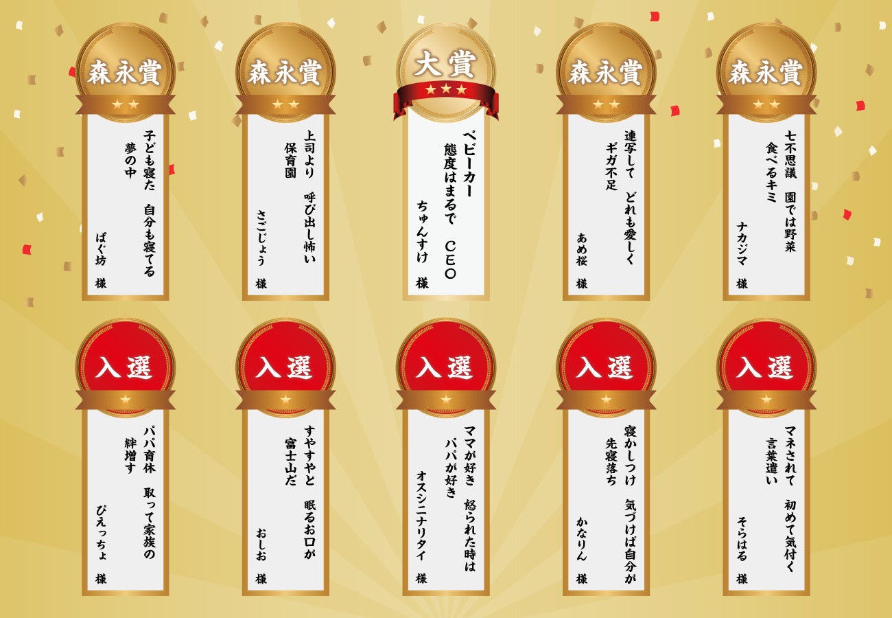 2023年8月1日から8月20日までアカチャンホンポ公式SNSや店頭で募集し、全国から600句以上の“子育てあるある”が寄せられました。その後、9月6日に大阪府内において選考会を開催し、森永乳業と赤ちゃん本舗の関係者が、1句1句に目を通しながら厳正に選考を行い、大賞1名、入賞5名、森永賞4名の計10名を選ばせていただきました。