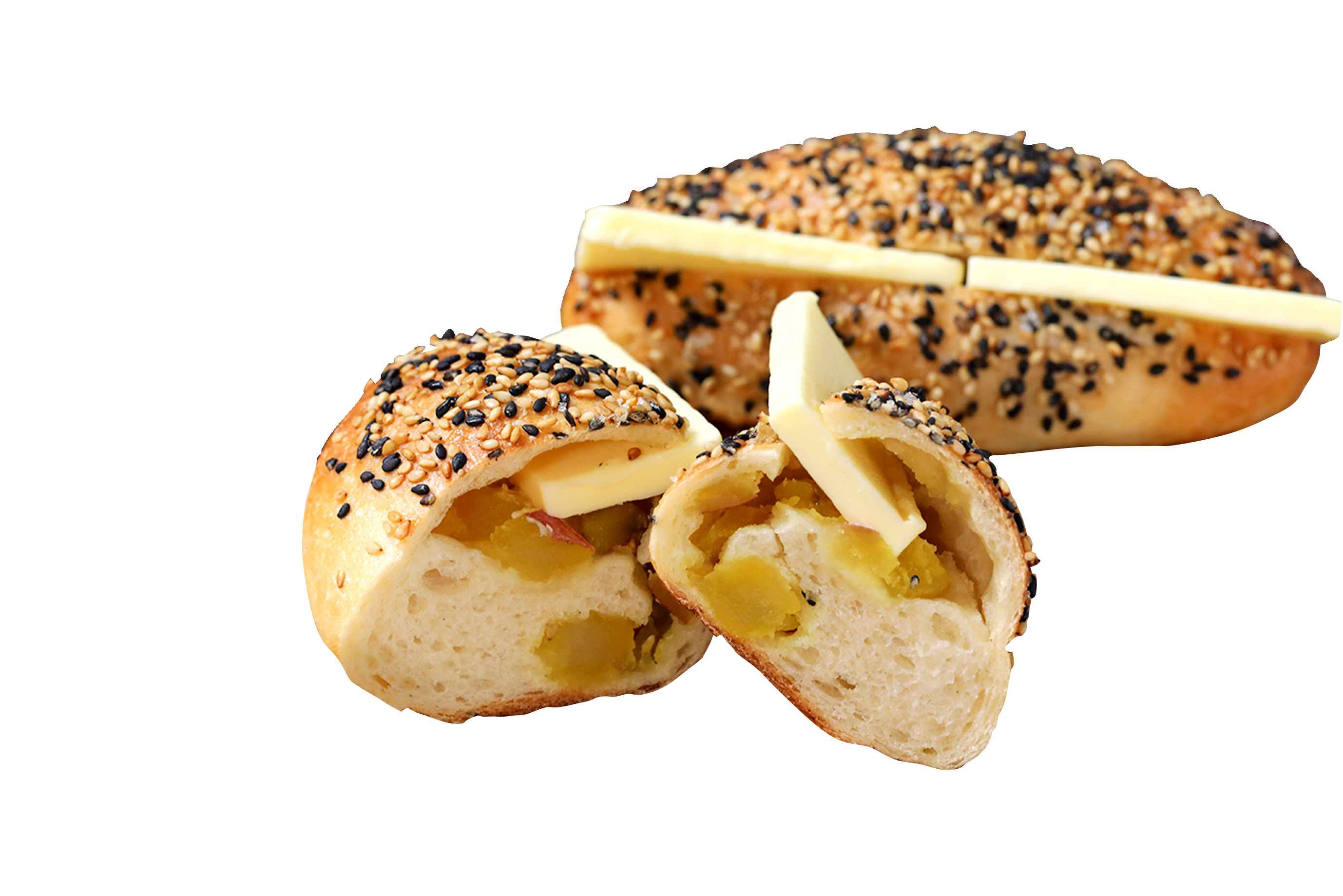 フランスパン生地に有塩バターをダイナミックに挟んだ定番商品『ジャポネ』のおいしさはそのままに、ゴロゴロ入ったさつまいもの甘味と有塩バターの塩味、ごまの香ばしさとザラメの食感が秋を感じさせる一品です。