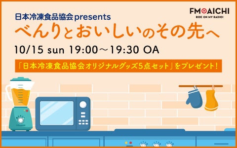 JFN系列の中部北陸のFM6局(FM AICHI、FM GIFU、レディオキューブFM三重、エフエム石川、FM福井、FMとやま)では、10月15日(日)19:00~19:30に特別番組「日本冷凍食品協会 presents べんりとおいしいのその先へ」を放送します。パーソナリティは高橋萌、ゲストに「一般社団法人 日本冷凍食品協会」広報部長の三浦佳子さんをお迎えして、冷凍食品をもっと上手に使うポイントや、意外と知られていない冷凍食品のおいしさの秘密などを伺っていきます。