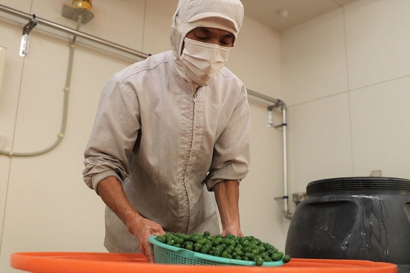 2代目園主の生み出した新漬けオリーブにはこだわりがあり、摘みたてを感じさせるような新鮮な緑色で、オリーブ独特の風味が感じられなければいけません。新鮮な緑色に仕上げようと思えばなるべく早摘みすればいいのですが、収穫が早すぎると果肉が固く、苦みが出てしまいます。一方で遅く収穫してしまっては鮮やかなオリーブ色に漬けあがらないため、木に実るオリーブの熟度を見極めて収穫し、速やかに漬け込みながら味を整えていくことが必要です。だからこそ新漬けオリーブは、オリーブ農家にとって出来上がるまで気を抜くことができない一品。ここまでの手間ひまをかけてでも、いいものを作ろうとこだわった2代目園主の製法で、井上誠耕園の味を守り続けています。