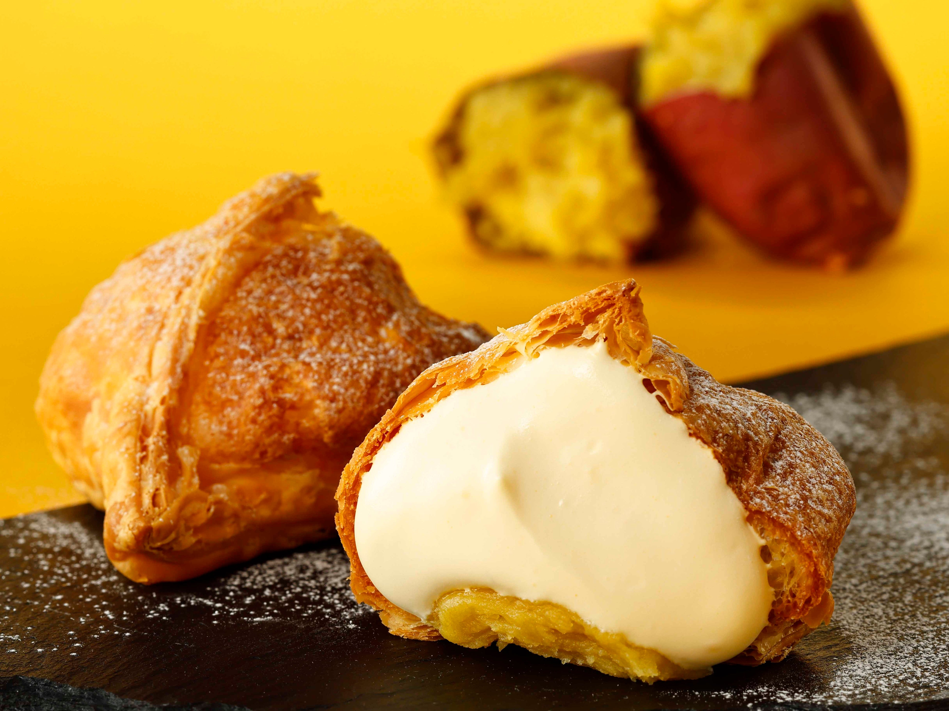 「ミルクパイ焼き芋」は、オーブンで焼き上げたサックサクのパイにクリームを入れた定番人気「ミルクパイ」の季節限定味です。しっかりした甘さが特徴の紅あずまのフィリングと北海道産のマスカルポーネチーズ、生クリーム、練乳で仕立てた焼き芋クリームに、さらに紅あずまのフィリングを加えた季節の訪れを感じる優しい味わいが特徴です。