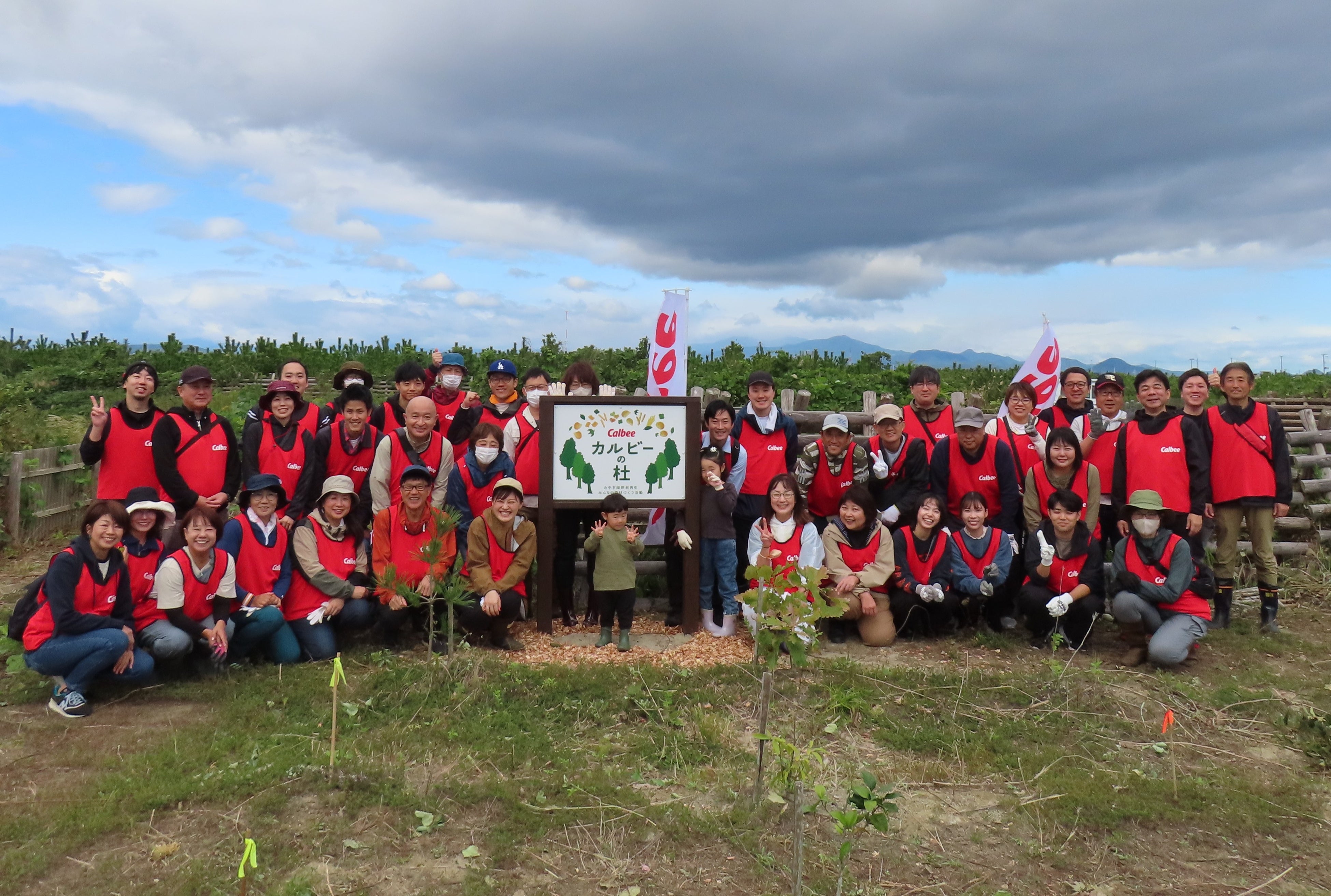 2023年10月7日、「カルビーの杜」にて植樹会を開催しました。当日は、社会貢献委員長、カルビー東日本支店の社員やその家族を中心に41名が参加し、植樹を行いました。