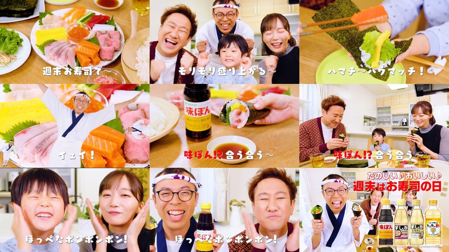 ジョイマンさんのリズムネタに乗せて、お寿司の「美味しさ」や「楽しさ」を伝える内容になっております。ストーリーは、お寿司屋さんに扮した高木さんが池谷さん家族の食卓に現れ、「週末~お寿司で~モリモリ盛り上がる~♪」「ハマチ~ハウマッチ!サーモン美味しいもん!」とリズムネタに乗せて、お寿司の美味しさと楽しさを表現します。加えて、「味ぽん!?合う合う~ほっぺたポンポンポン!」と「味ぽん」とお寿司の意外な相性の良さに皆が笑顔になります。最後は「たのしい♪おいしい♪週末はお寿司の日」とコミカルにお寿司の魅力を伝える内容になっております。ジョイマンさんの口ずさみたくなるリズムネタにぜひご注目下さい。