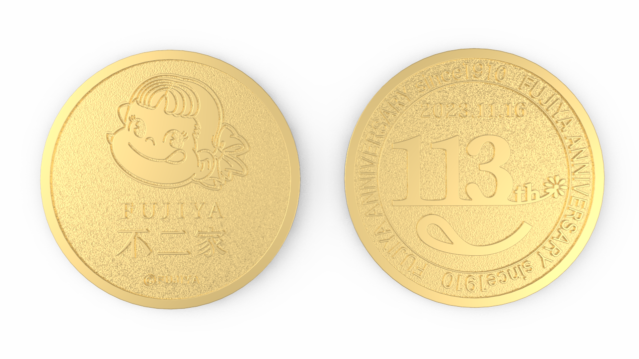 創業日にあたる11月16日(木)限定で、税込1,130円以上お買い上げのお客様に先着で「113周年ペコちゃんオリジナルメダル」1枚をプレゼントします。今年9月にリニューアルした、不二家洋菓子店の新店舗ロゴ入りの2023年限定デザインです。