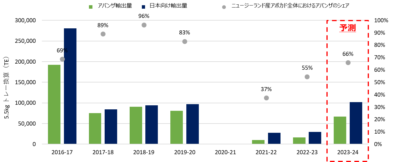 日本市場におけるニュージーランド産アボカドの輸出量とシェア