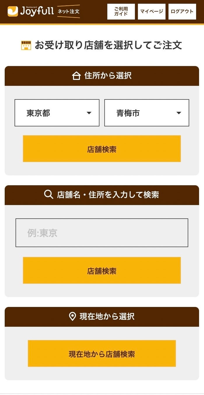 ネット注文ページ(https://joyfull-weborder.jp)からご利用店舗と受取り日時を選択し、