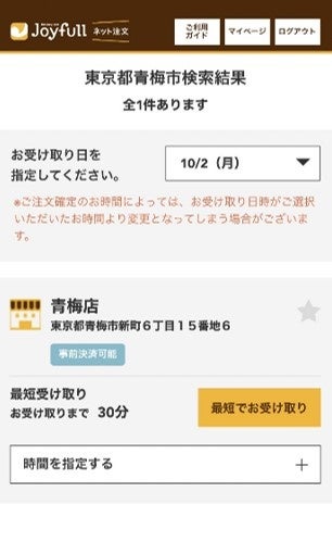 ネット注文ページ(https://joyfull-weborder.jp)からご利用店舗と受取り日時を選択し、