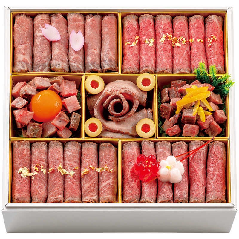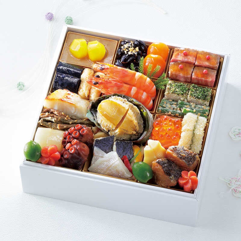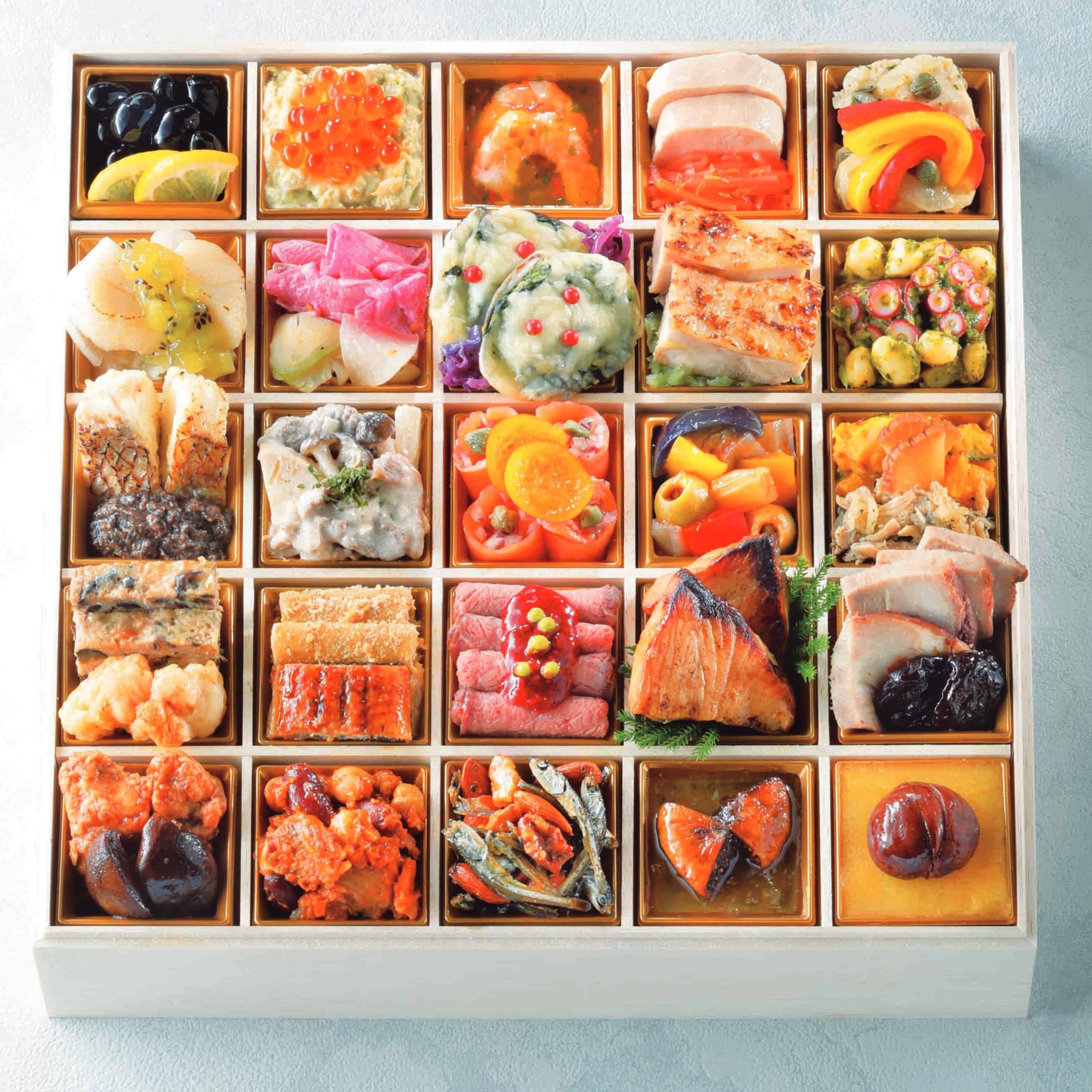 ワインやお酒と相性を考え抜いた「おつまみおせち」や、松坂牛の 7 種の部位のローストビーフを詰め合わせた「肉おせち」、人気スイーツ店の見た目にも美しい「スイーツおせち」など豊富なラインアップ。