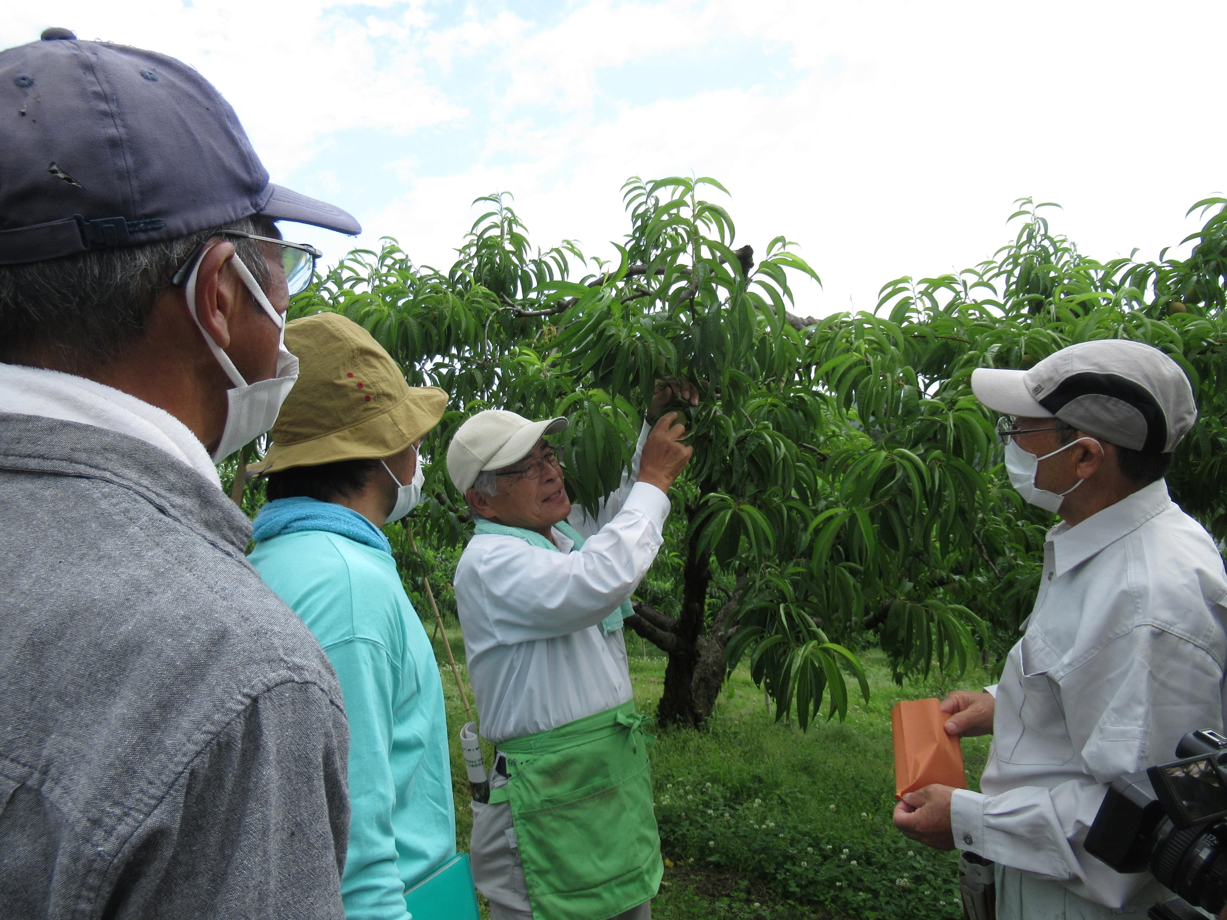 阿新桃部会は昭和42年に組織された歴史ある生産組合です。ピークの昭和56年には155戸の部会員が63haの面積で桃を栽培していたのですが、部会員の高齢化に伴って産地規模を適正化し、現在は51戸22haの面積で栽培しています。