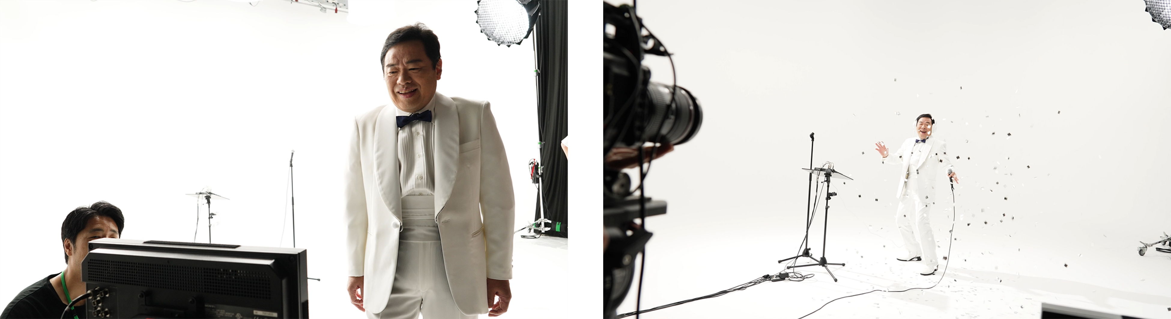 一方、面白くするための演出にも本気のグッチ裕三さんは、事前に銀吹雪の紙質やポケットに入れる量、ポケットの深さなどを入念にチェックしたり、マイクにぶつかるシーンのためにマイクを浅くセットしたりと準備を徹底。さらに派手にしたいと考えた現場スタッフの発案にも快く応じてくださり、当初の予定にはなかったターンの演出をその場で採用しました。「ターンの際にヘッドホンが引っかかってしまうかも」と不安を口にしながらも本番は一発で成功。カットの声がかかるとご自身でも思わず笑ってしまうほどウィットに飛んだ仕上がりになり、現場も笑い声溢れる和やかな雰囲気となりました。