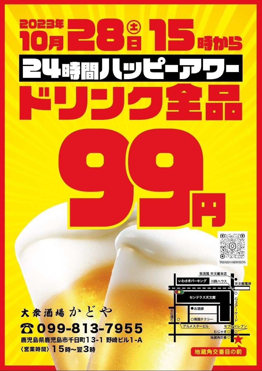という思いから、私達は24時間超お得に、気軽に飲んで頂けるイベント『天文館スーパーハッピーアワー』を開催する事を企画致しました。