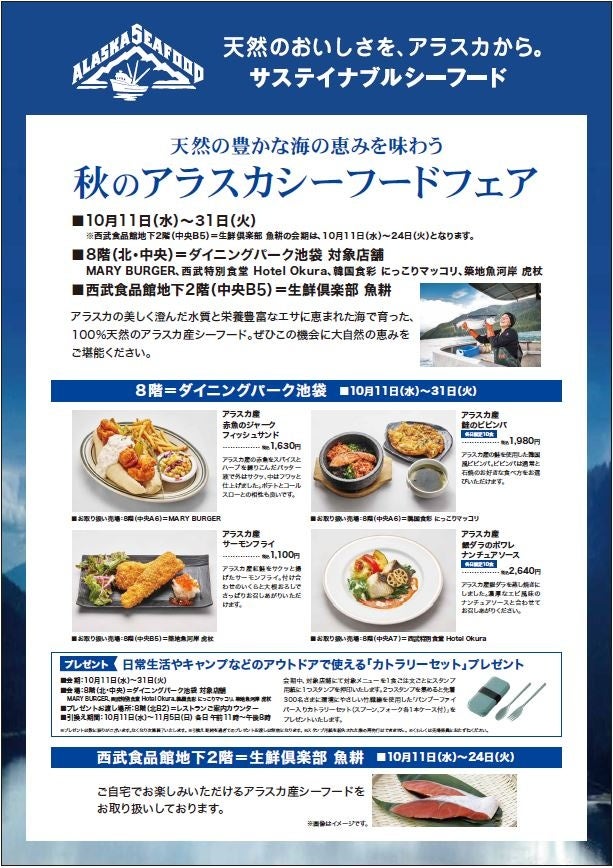 フェア期間中は、地下食品売り場の鮮魚コーナーで100%天然でサステイナブルなアラスカ産シーフードを販売いただくだけでなく、レストランフロアでもアラスカ産紅鮭や赤魚、銀だらなどを使用した特別メニューを展開いただきます。ご自宅で、レストランで、アラスカの海の恵みでサステイナブルな食体験をお楽しみください。