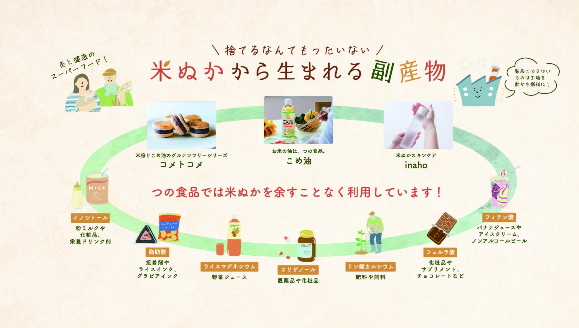 本来、米ぬかは肥料や畜産飼料として使われる以外は廃棄されることがほとんどでしたが、築野食品工業が積み重ねてきた研究と技術により、米ぬかの成分を抽出することで、こめ油だけでなく食品、化学、医療、化粧品等の幅広い分野への有効活用を実現しています。築野食品工業は、今後も国内の米ぬかを活用することで地球・生産者・消費者の良い循環を実現し、サステナブルな世界を目指してます。
