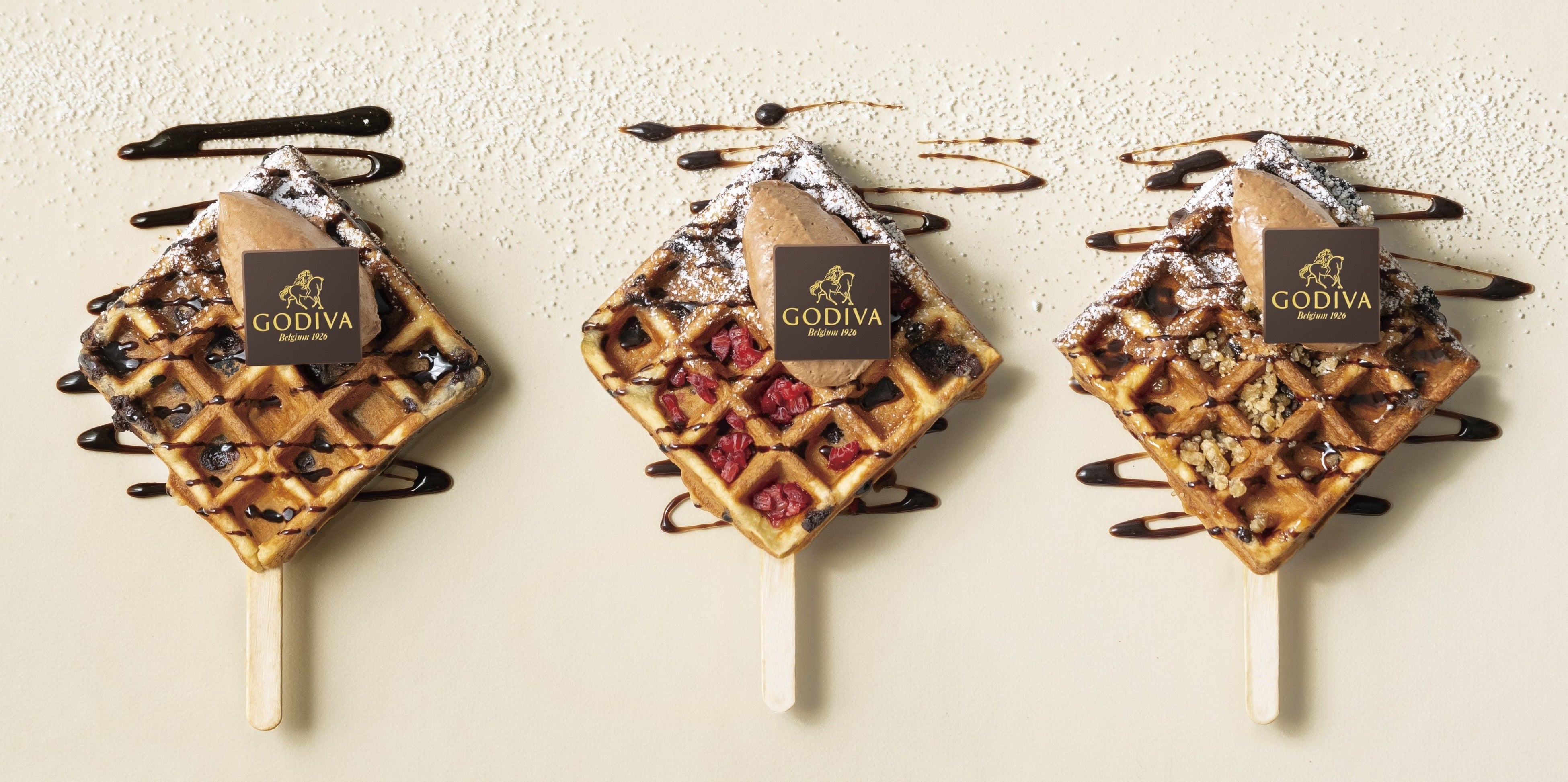 ゴディバカフェ ジ アウトレット湘南平塚店限定で、食べ歩きにもぴったりの、焼きたてのワッフルポップ3種類を販売します。
