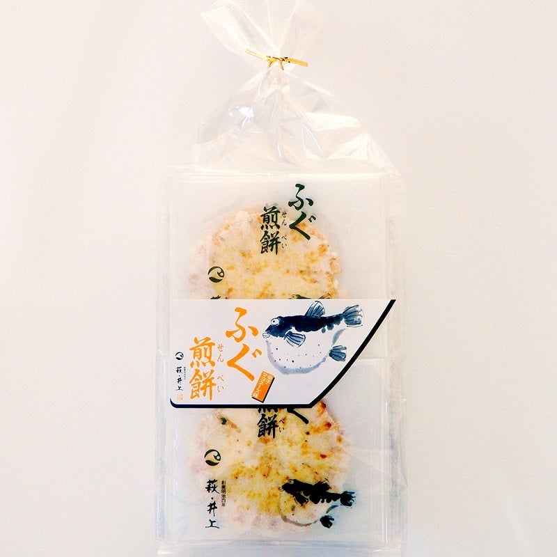 ふぐの身を練りこみ、サクッとした食感とぴりっと辛い、辛子マヨネーズで味付けした珍しいお煎餅です。お茶うけや行楽のおともに、ビールのおつまみやおやつに最適です。