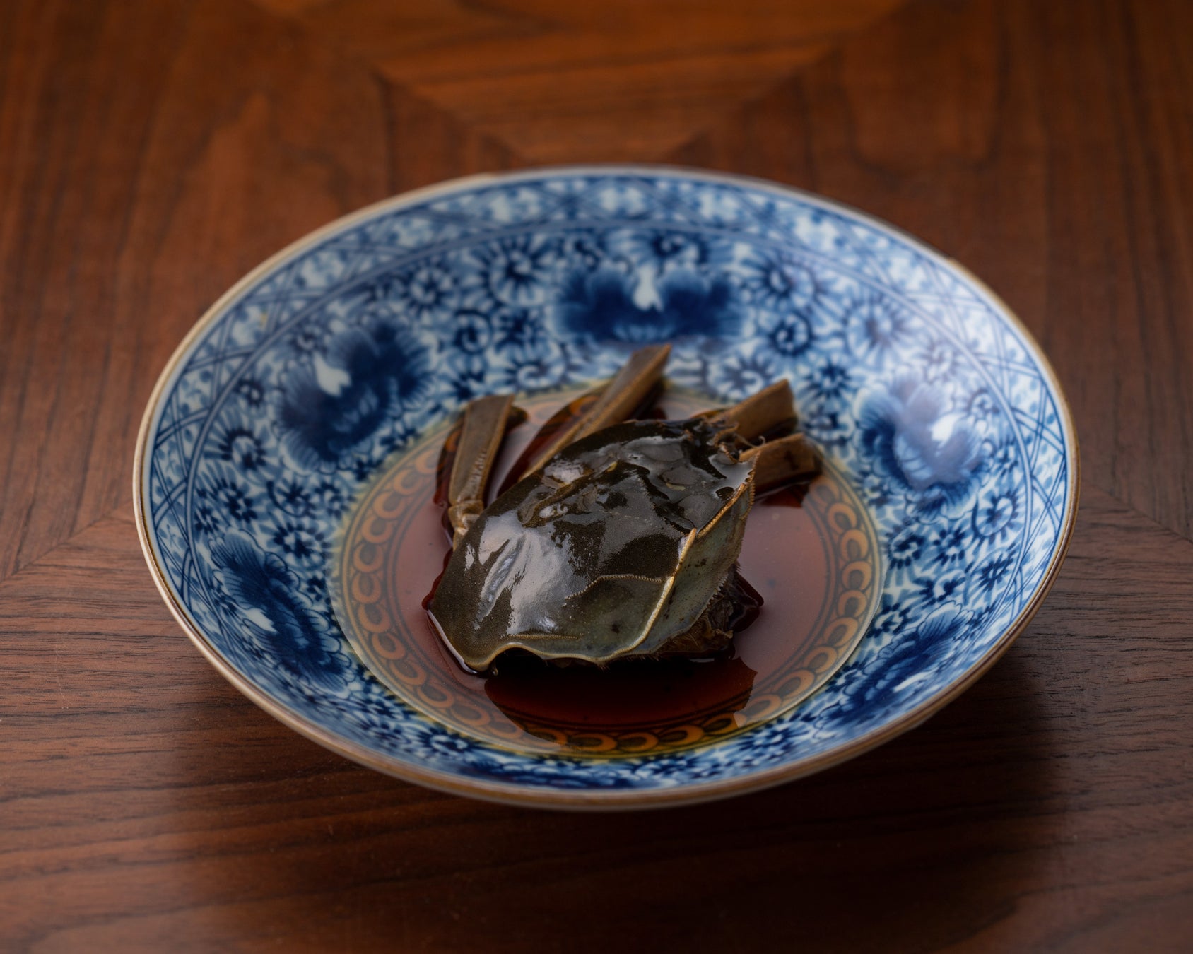 数種類の香辛料や香味野菜に柑橘を効かせた自家製の紹興酒ダレに、じっくりと一週間漬けた上海蟹。