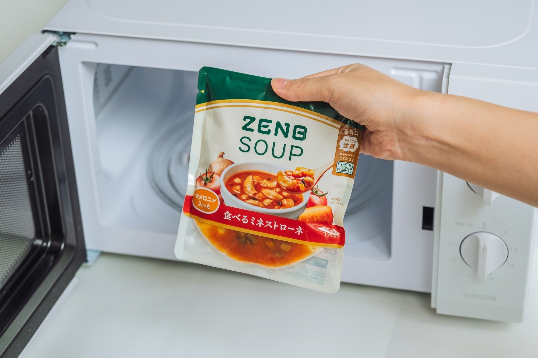酸味や旨みといったトマト本来の味わいを活かし、バジルの爽やかさをアクセントに加えた「ZENBマメロニ」入りミネストローネ。フレッシュ感のあるトマトをベースに、ほっくり食感のひよこ豆や、やさしい食感の豆パスタ、プリっと食感のマッシュルームと、いろんな食感を楽しめます。