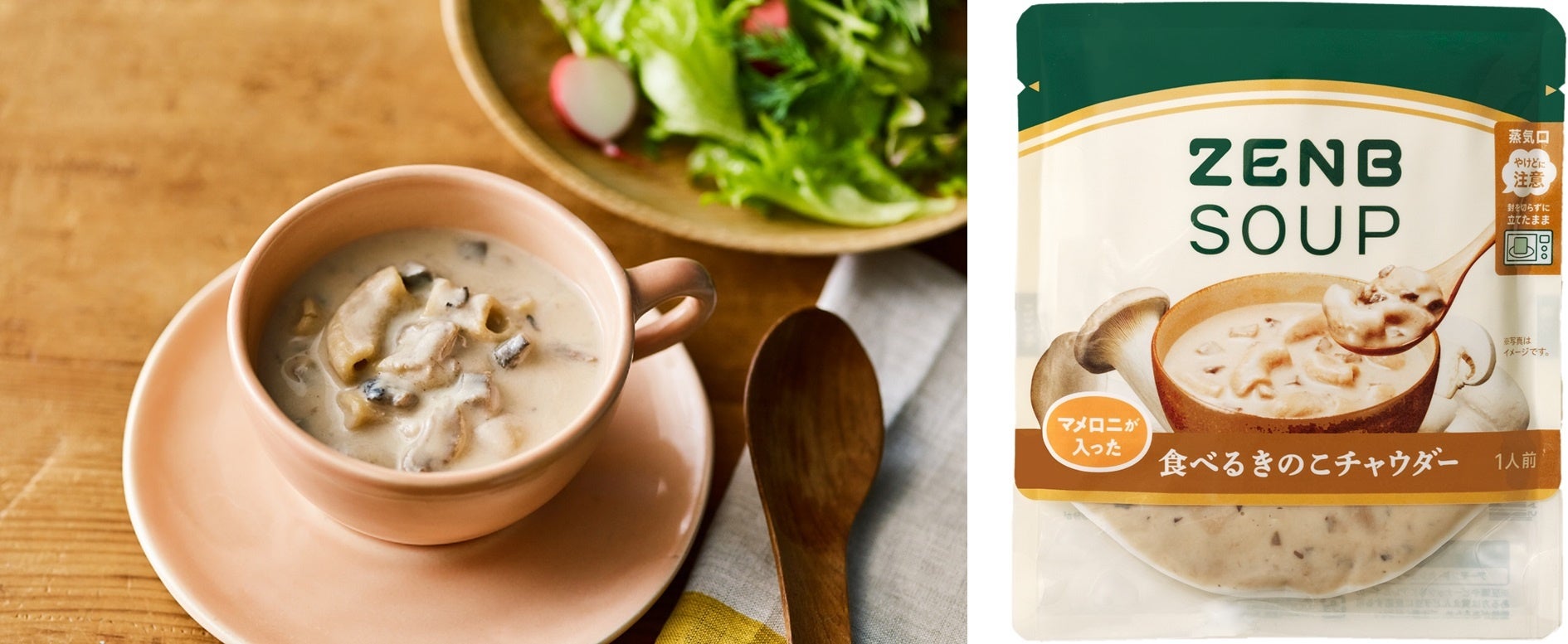 きのこの旨みと香りがふわっと広がる口当たりまろやかな、「ZENBマメロニ」入りチャウダー。じっくりソテーした3種のきのこを加えることで旨みや香りを引き出し、カシューナッツやアーモンドを合わせて、コク深くクリーミーな味わいに仕上げました。やさしい食感の豆パスタや、歯ごたえのあるエリンギやマッシュルームの食感も楽しめます。
