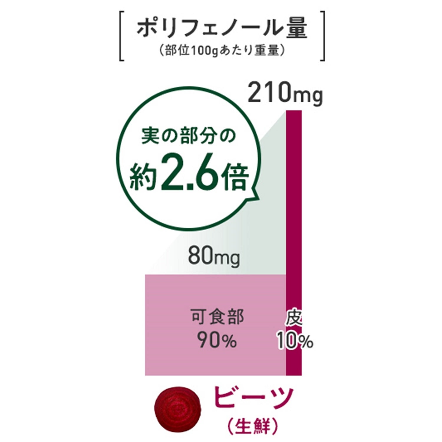 色鮮やかな赤色を活かした料理やスイーツに使われることが多く、ポリフェノールや食物繊維など栄養豊富でスーパーフードとも呼ばれるビーツ。特に、普段食べずに捨ててしまう皮の部分には栄養がたっぷり含まれており、例えば、ポリフェノールは実の部分の約2.6倍摂ることができます。