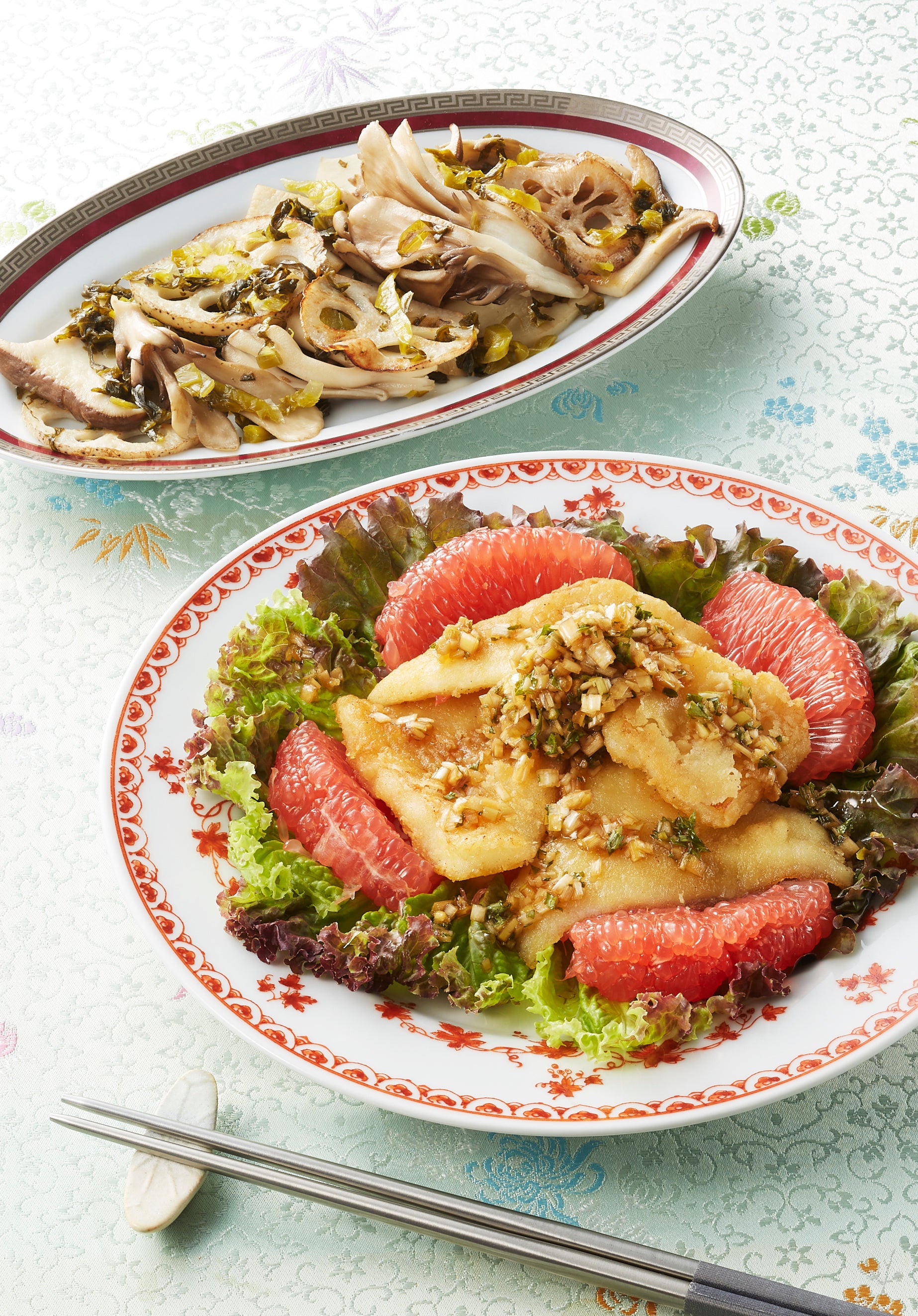 魚フライを薬味と柑橘入りの甘酢ソースでさっぱり食べられる料理です。柑橘の種類を変えても面白い発見があるので試してみてください。副菜の舞茸は時間があれば軽く干して味を凝縮させると一層美味しいです。
