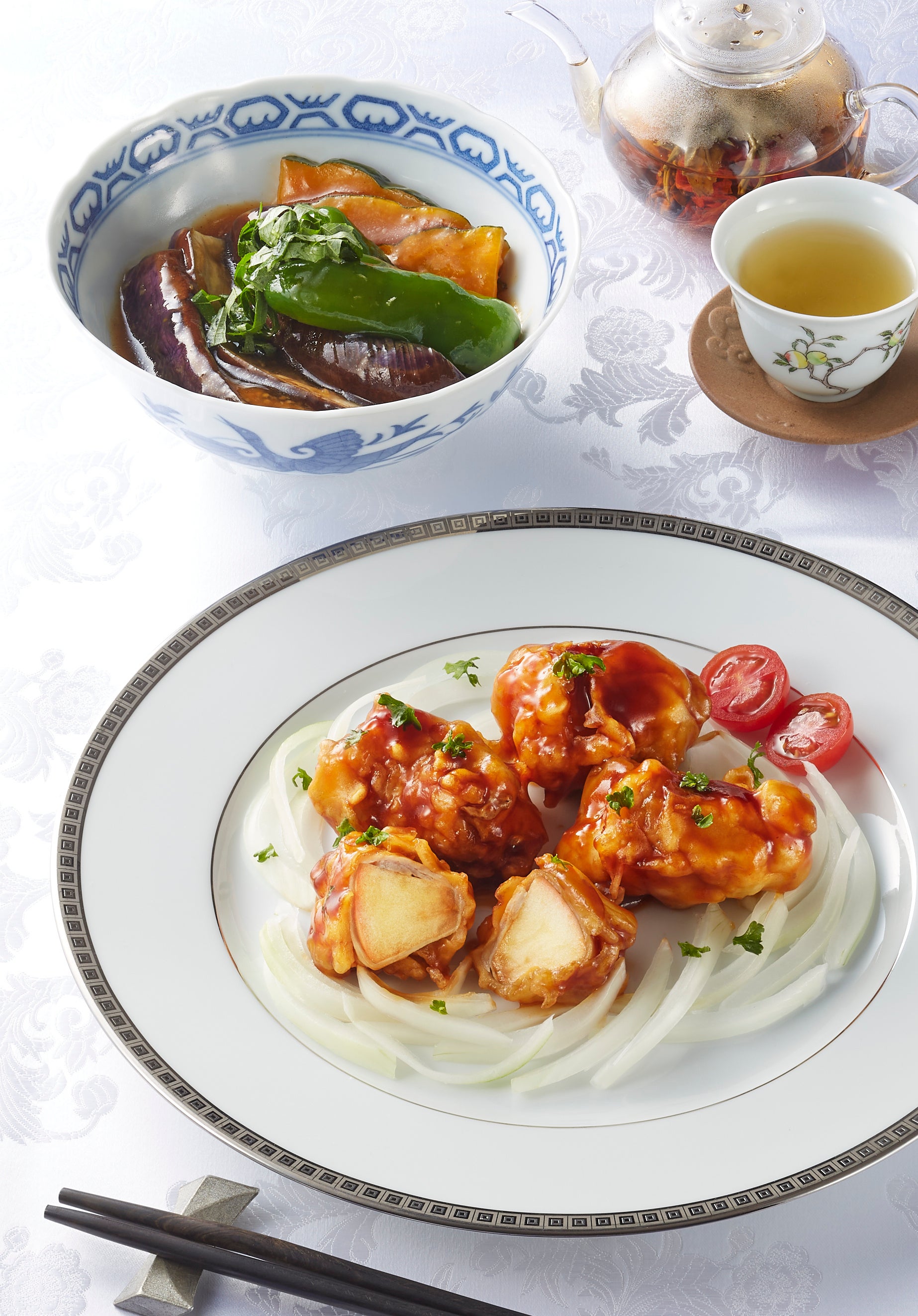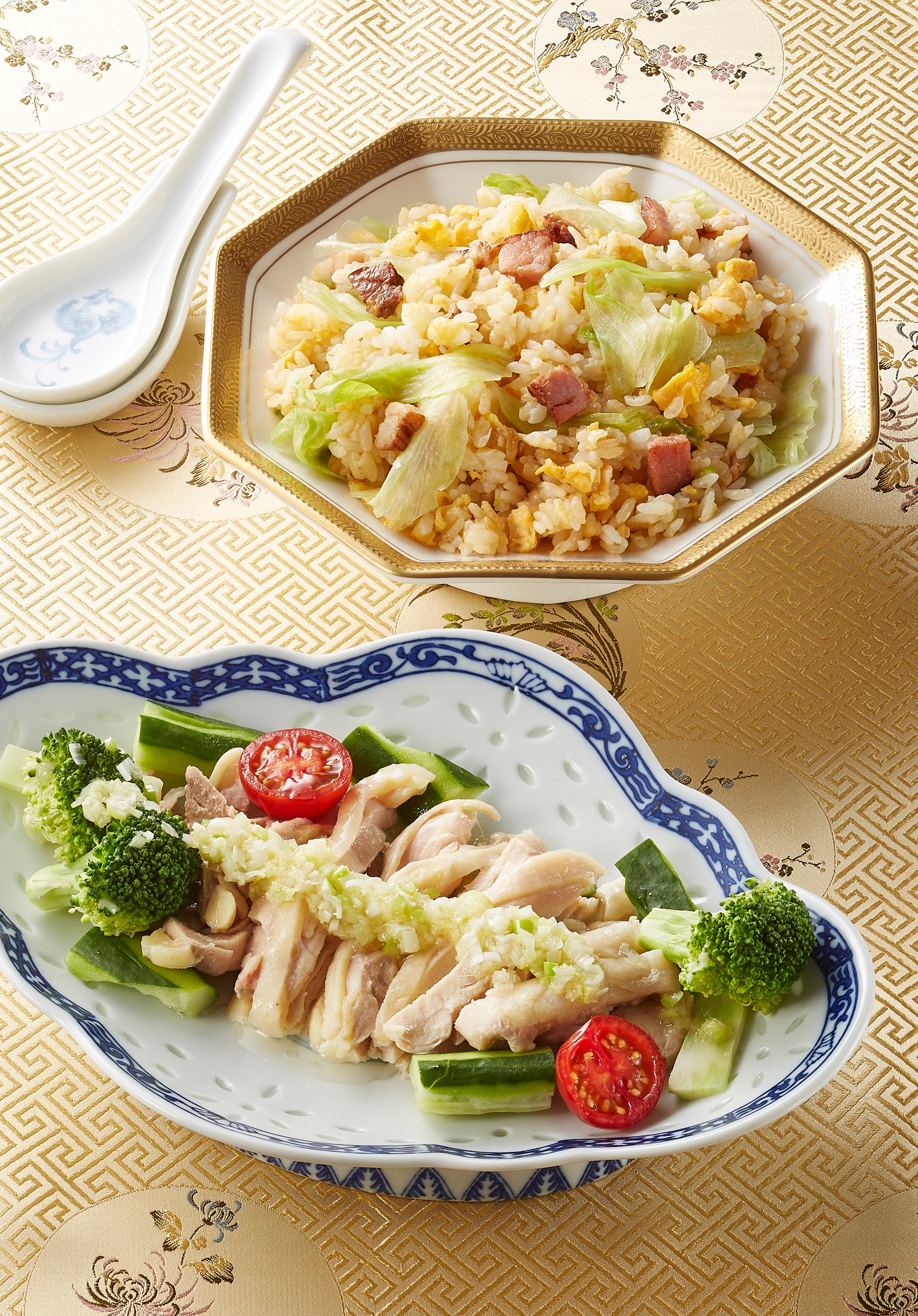 鶏もも肉をしっとり柔らかく仕上げるため、火入れ方法にこだわりました。今回は葱と生姜のさっぱりとしたソースでお召し上がりいただきますが、胡麻ソースやピリ辛ソースなどでのアレンジもお楽しみいただけます。炒飯の食材は、焼豚と葱だけでなくレタスも合わせて使用しました。レタスによるみずみずしい食感がやみつきになります。