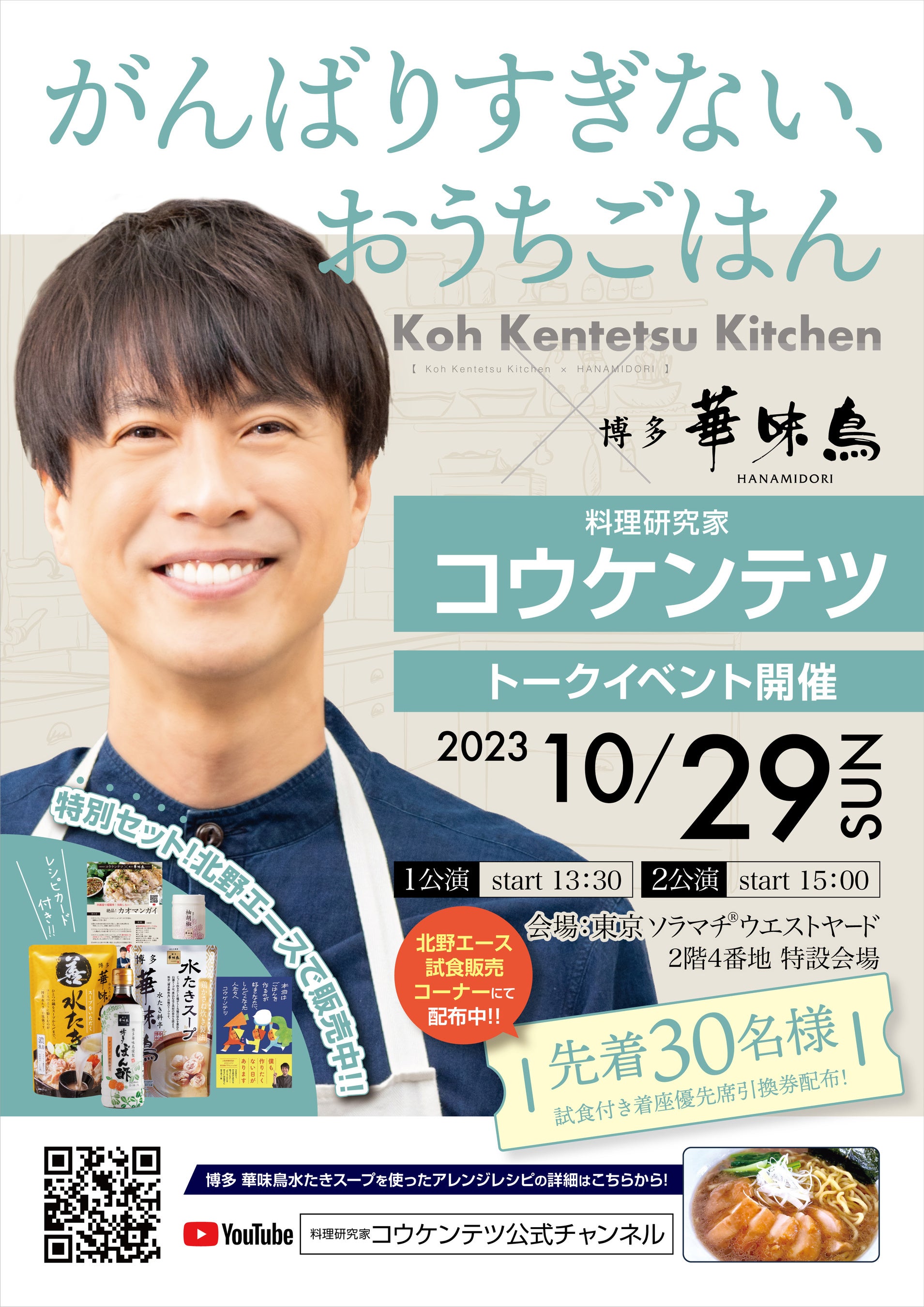 公開を記念してトークイベントを開催、コウケンテツさんYouTubeチャンネルで150万回再生した人気レシピ「カオマンガイ」を水たきスープでアレンジ、限定数量を来場者に振舞う企画もご用意致しました。