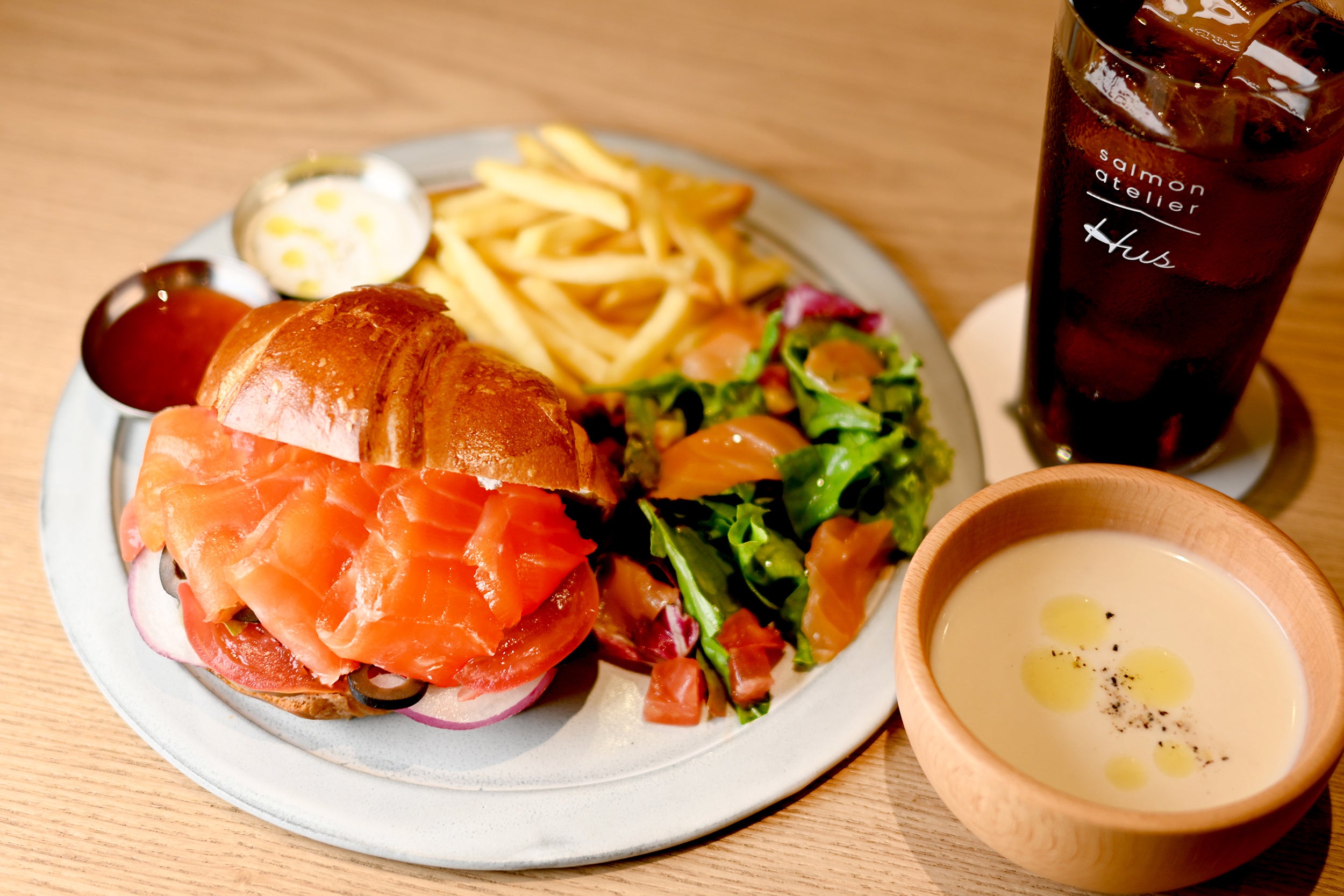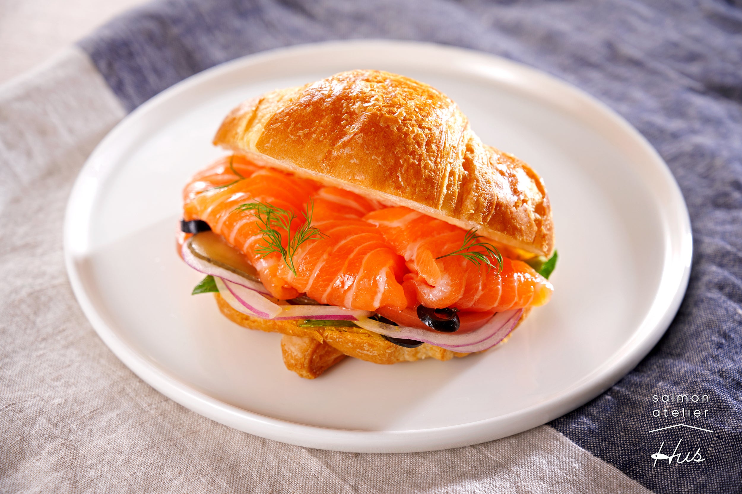 水揚げされたばかりの生のノルウェーサーモンを一度も冷凍せず燻製し、サクサクのクロワッサンで挟んで贅沢なサンドイッチに。サーモンサラダとフライドポテトを添えて食べ応えのあるプレートメニューに仕上げました。