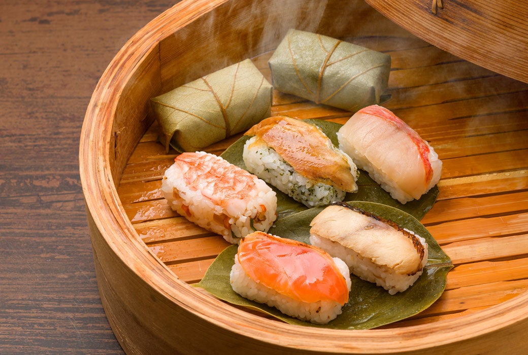 奈良名産の「柿の葉寿司」を冷凍でお届けします。電子レンジで温めてお召し上がりいただく「蒸し寿司」タイプです。