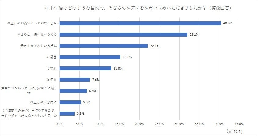 「ゐざさのお寿司を年末年始に購入した目的」(複数回答可)をたずねたところ、「お正月のお祝いとして」と答えた人が40.5%を占めて最も多く、次いで「おせちと一緒に食べるため」と回答した人が32.1%でした。