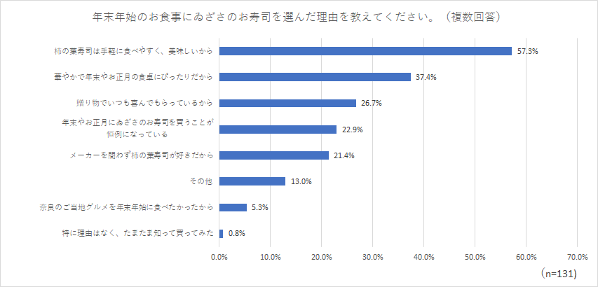 「年末年始にゐざさのお寿司を購入した理由」(複数回答可)を聞いたところ、「柿の葉寿司は手軽に食べられる」と答えた人が過半数以上の57.3%でした。「柿の葉寿司」は柿の葉で一つずつお寿司を包んでいる特徴があるため、忙しい年末年始に「ちょっとつまめる」ことなどが購入いただく大きな理由であることがわかりました。