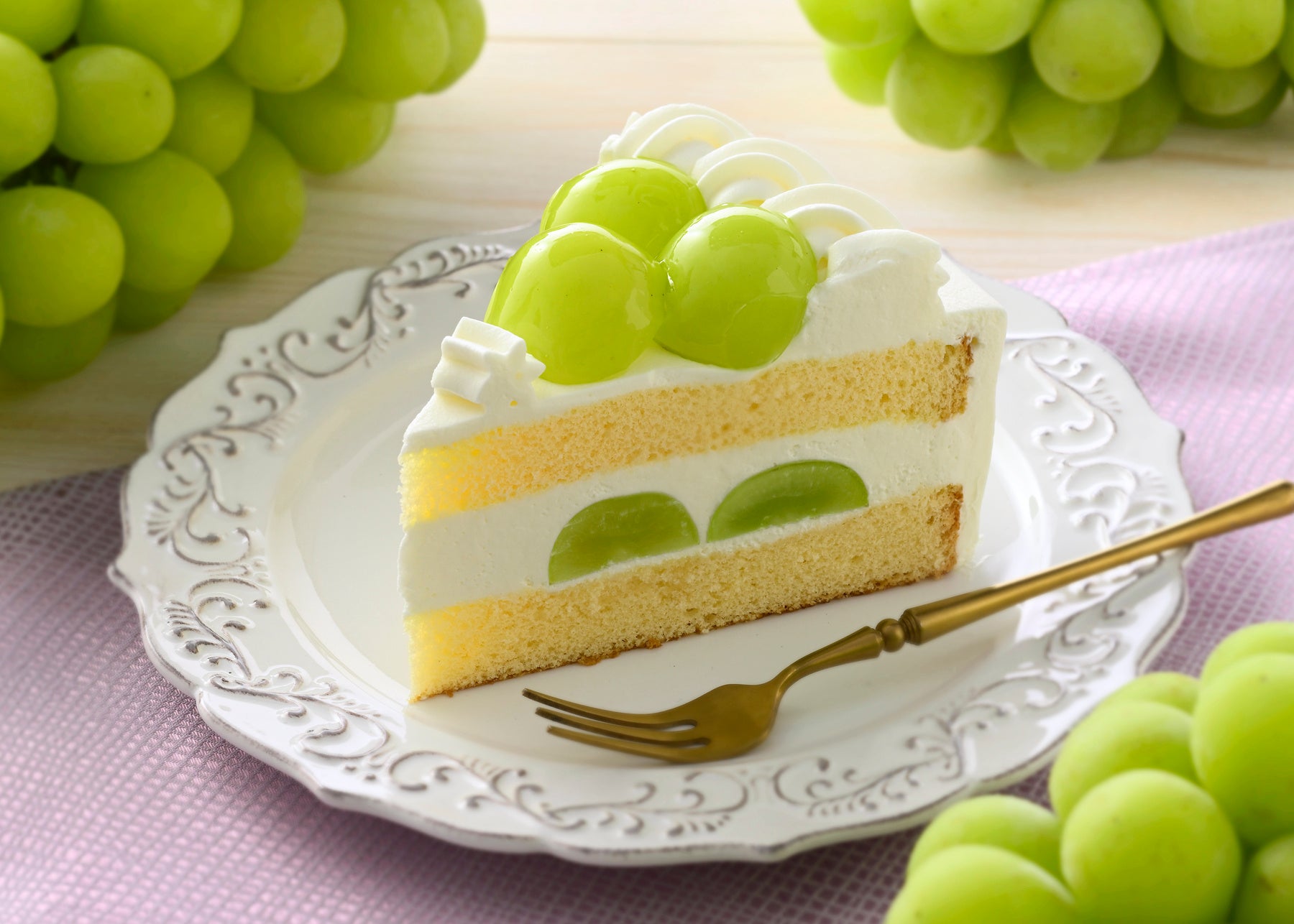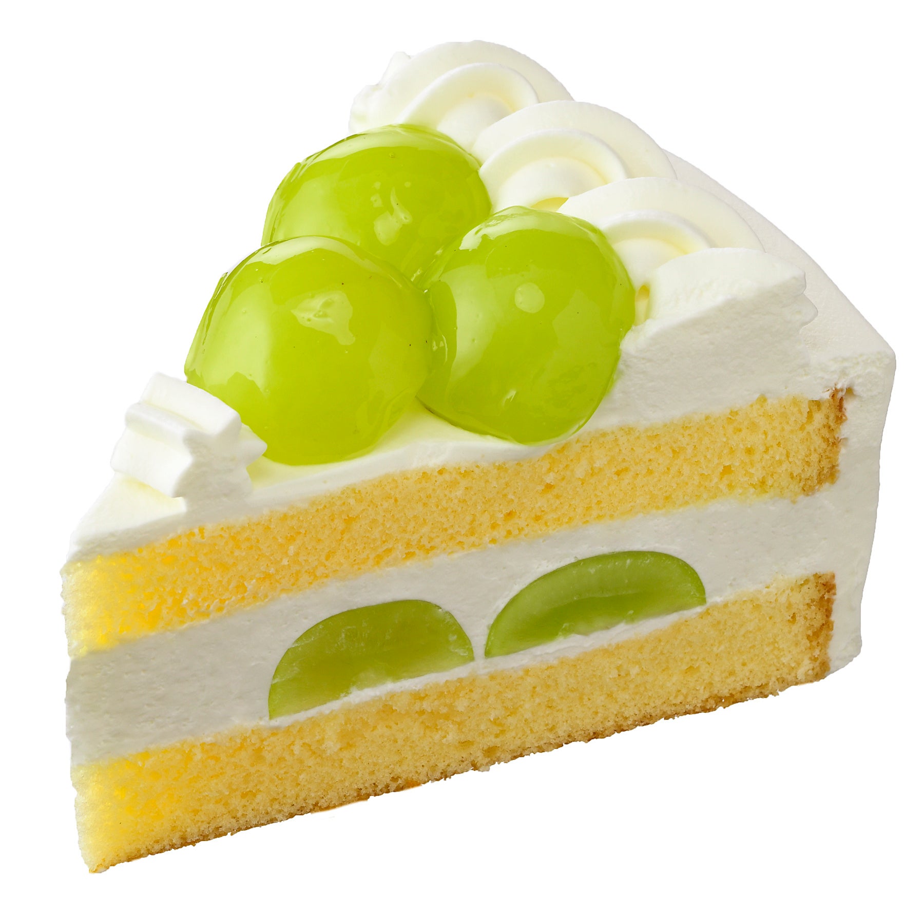特長:ジューシーな果肉と上品な甘み&香りが特長の「シャインマスカット」を上面およびサンドに贅沢に使用した、季節限定のショートケーキです。口いっぱいにみずみずしさがあふれるシャインマスカット、きめ細かなスポンジ、生クリーム入りホイップクリームの爽やかな一体感をお楽しみください。