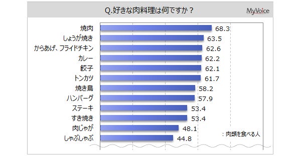肉類を食べる人に好きな肉料理を聞いたところ(複数回答)、「焼肉」「しょうが焼き」「からあげ、フライドチキン」「カレー」「餃子」「トンカツ」が各60%台で上位にあがっています。