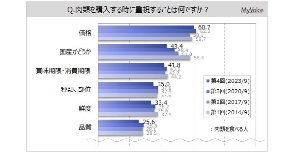 ■肉類を食べる人の購入時の重視点は、「価格」が6割強、「国産かどうか」「賞味期限・消費期限」が各4割強、「種類、部位」「鮮度」が各30%台。過去調査と比べて、「国産かどうか」は減少傾向