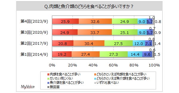 <今 回>(2023/9)https://myel.myvoice.jp/products/detail.php?product_id=30202 上記設問の他に、よく食べる「肉の種類」「肉の部位」、「好きな肉の種類」も聞いています。 <第3回>(2020/9)https://myel.myvoice.jp/products/detail.php?product_id=26601 <第2回>(2017/9)https://myel.myvoice.jp/products/detail.php?product_id=23003 |