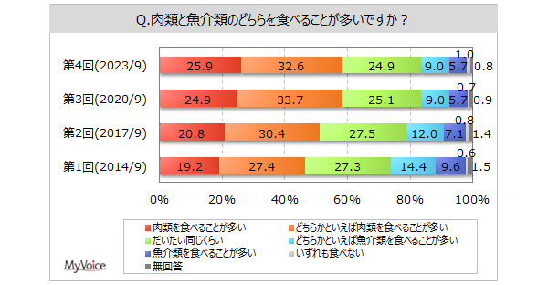 <今 回>(2023/9)https://myel.myvoice.jp/products/detail.php?product_id=30202 上記設問の他に、よく食べる「肉の種類」「肉の部位」、「好きな肉の種類」も聞いています。 <第3回>(2020/9)https://myel.myvoice.jp/products/detail.php?product_id=26601 <第2回>(2017/9)https://myel.myvoice.jp/products/detail.php?product_id=23003 |