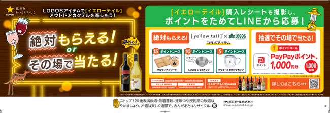 本キャンペーンは[イエローテイル]の対象商品を購入し、LINE公式アカウントの【[イエローテイル]キャンペーン】を友だちに追加して、お買い上げレシート画像をアップのうえポイントをためて応募するキャンペーンです。ポイントに応じてLOGOSとのコラボレーションアイテムが必ずもらえる「絶対もらえる!」コースとその場で1,000円分のPayPayポイントが1,000名様に当たる「その場で当たる!」コースがあります。