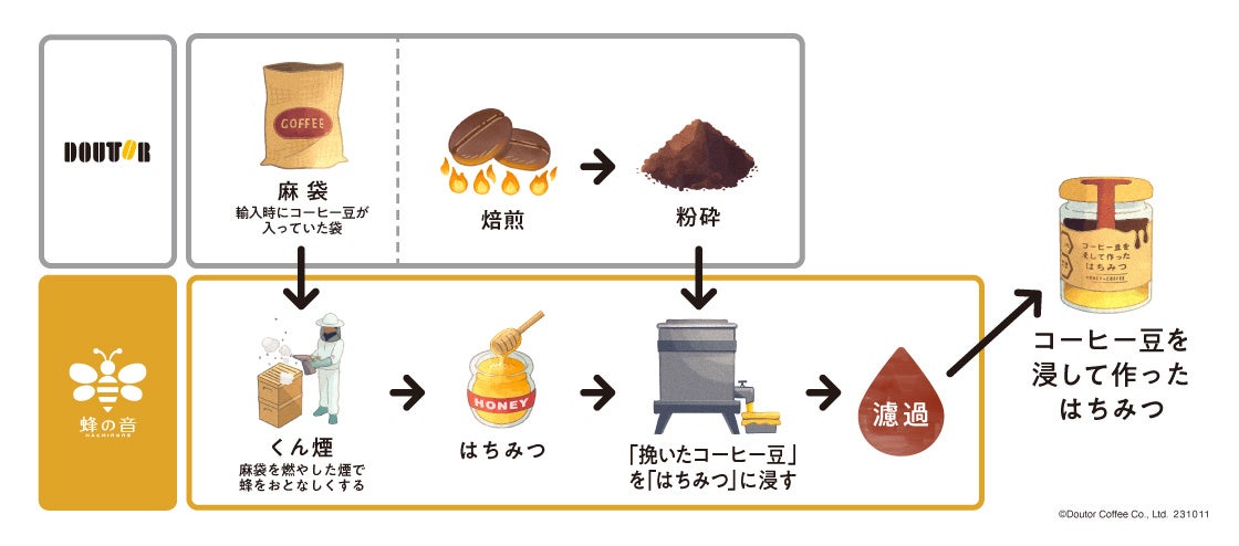 「蜂の音」とドトールコーヒーでは、コーヒーの生豆輸送に使われて廃棄される麻袋の一部を、養蜂に必要なくん煙の燃料として利用する取り組みを行っています。