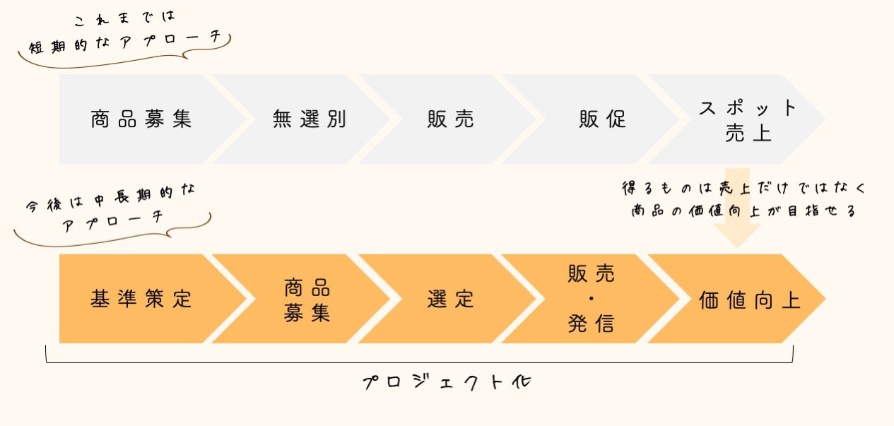 全国商工会連合会を通じて、全国各地から募集テーマに沿う商品を募集。バイヤーが1つ1つ厳選した商品を、販売・発信いたします。中長期的な視点で「日本の食文化を伝える」プロジェクトとして消費者と地域事業者の啓発に取り組みます。