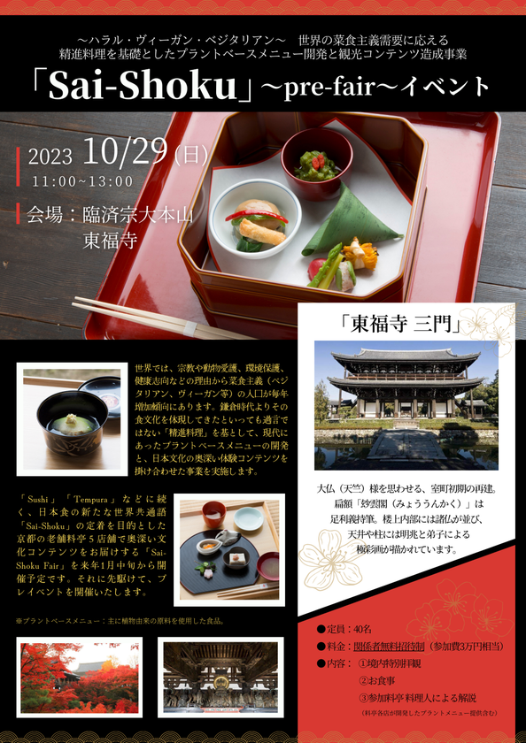 「Sushi」「Tempura」などに続く、日本食の新たな世界共通語「Sai-Shoku」を創出するため、京都の老舗料亭各店による奥深い文化コンテンツを提供する「Sai-Shoku Fair」を来年1月中旬から開催予定。それに先駆けて、国内外のメディア関係者をお招きしたプレイベントを2023年10月29日(日)、臨済宗大本山 東福寺にて開催いたします。